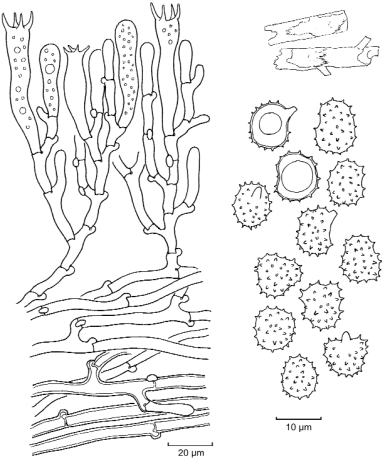 Subicular hyphae brownish, with clamps, thick-walled, not encrusted, 4-6 µm wide