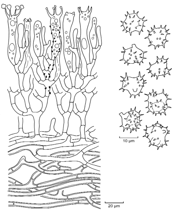Spores: brownish, frontally triangular, laterally irregularly rounded to