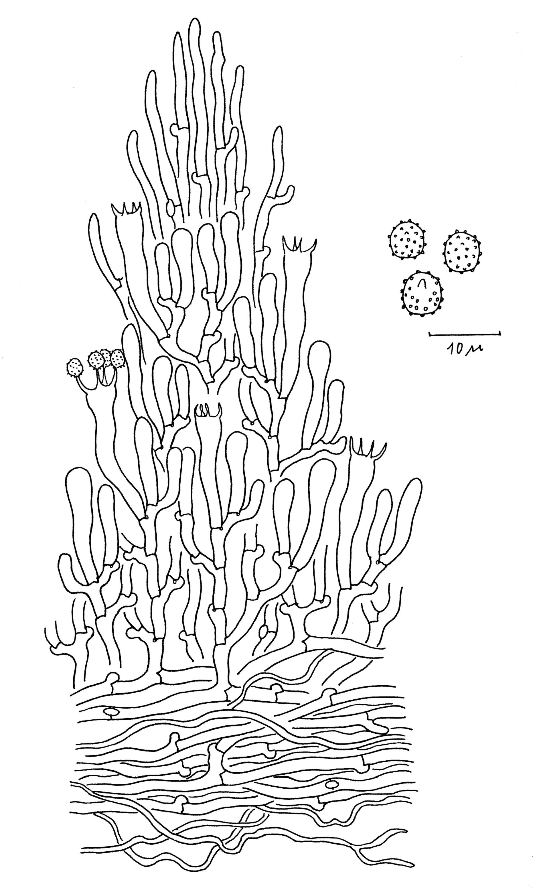 Sporen: bräunlich, frontal und lateral rundlich, 4,5-6 µm, warzig