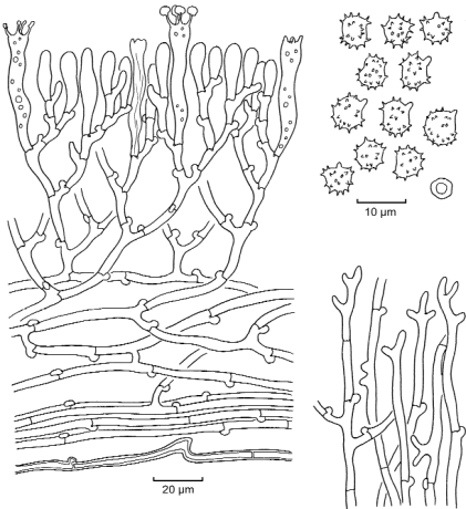 Subicular hyphae regular, 24 (5) ΅m, mostly branched at some distance