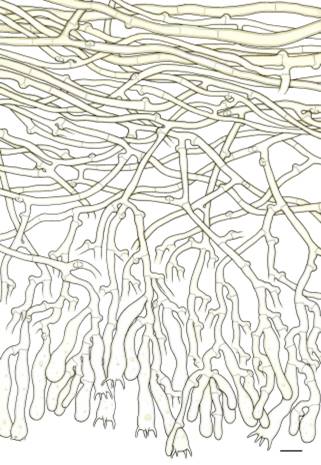 Subikularhyphen: hyalin bis gelblich, mit Schnallen, dünn- bis dickwandig (0,5-1,5 µm), nicht inkrustiert, 2,5-4,5 µm breit