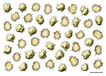 Sporen: bräunlich, frontal und lateral triangulär und gelappt, 5,5-6,5 µm, Stacheln bis 1,5 µm lang