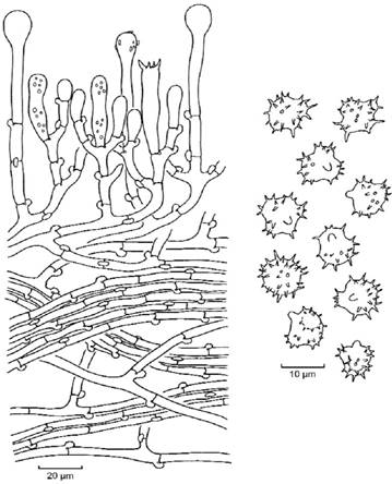 Sporen: bräunlich, frontal und lateral unregelmäßig rundlich, teilweise gelappt, 7-9,5 µm, Stacheln bis 2µm lang,