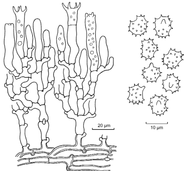 Subicular hyphae hyaline to brownish, partially swollen and short-celled, with clamps,