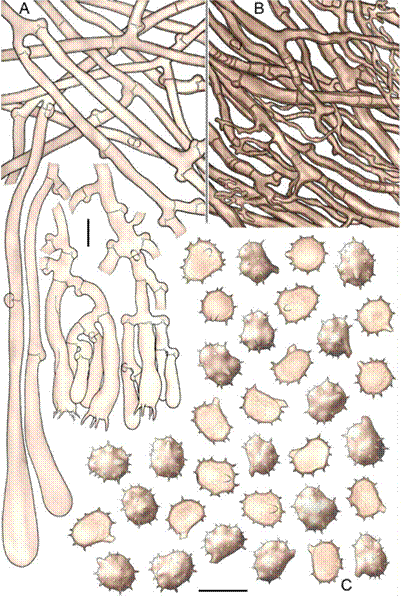 skeletal hyphae, 24 µm in diam. that may build incomplete and reduced labyrithiform structures of richly branched 12 µm wide