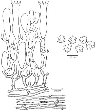 Sporen: bräunlich, frontal triangulär unregelmäßig rundlich und lateral unregelmäßig elliptisch, 7,5-9,5 µm, Stacheln bis 1,5 µm lang