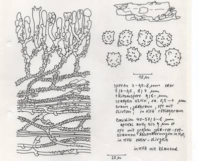 Sporen: bräunlich, frontal und lateral unregelmäßig rundlich, teilweise gelappt, 6-8 µm, Stacheln bis 1 µm lang
